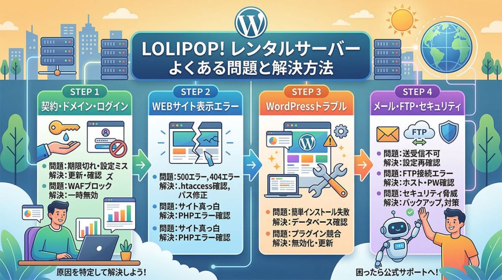 WordPress・接続エラー・表示トラブルを解説 LOLIPOP!レンタルサーバーは、日本で非常に人気のあるレンタルサーバーですが、利用しているとさまざまなトラブルが発生することがあります。 例えば次のような問題です。