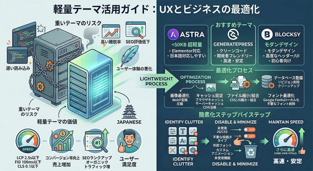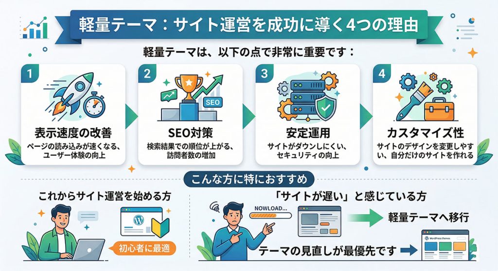 今回は、軽量テーマ(ライトウェイトテーマ)を使うメリットと、実際の運用方法について、初心者の方でも分かりやすく解説します。
